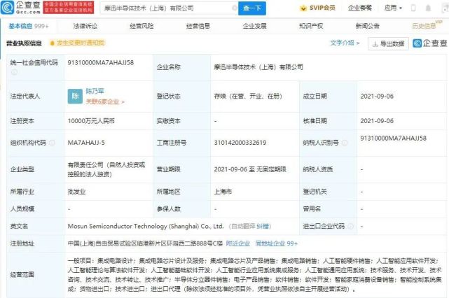 9月8日消息,据企查查显示,摩迅半导体技术(上海)有限公司成立,公司注册地位于临港新片区。法定代表人为陈乃军,注册资本1亿元人民币。经营范围包含:集成电路设计;集成电路芯片设计及服务;集成电路芯片及产品销售;集成电路销售等。