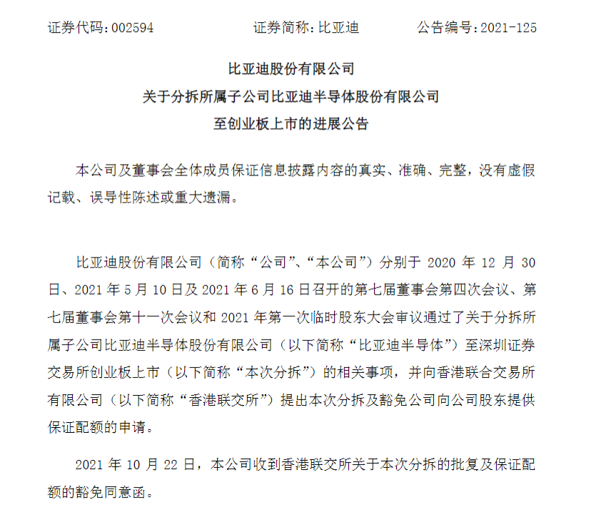 10月25日晚间,比亚迪公告称,香港联交所同意分拆比亚迪半导体至深交所创业板上市,这意味着国内汽车巨头比亚迪成功孵化出一只独角兽。